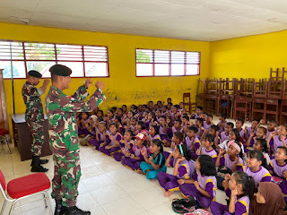 MedanEkspress | Ambon - Pos Air Buaya yang tergabung dalam Satgas Pamrahwan Maluku Yonarmed 1 Kostrad melaksanakan kegiatan perbantuan sebagai Tenaga Pendidik di SD 05 Kepalamadan, Desa Nanali Kec. Kepalamadan Kabupaten Buru Selatan, Maluku, Senin (20/02/2023).